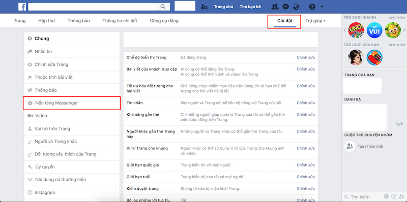 Tại Facebook Fanpage vào mục Cài đặt sau đó click Nền tảng Messenger (Facebook fanpage go to Settings tab then click to Messenger Platform =>dành cho ai dùng bản tiếng Anh) như hình dưới