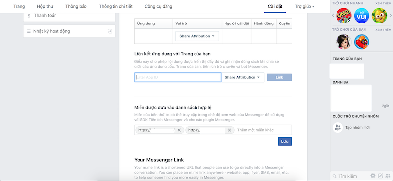 Cuộn chuột tới mục Liên kết ứng dụng tới Trang của bạn (Link Your App to Your Page) nhập Mã ứng dụng vừa copy trên sau đó ấn Link