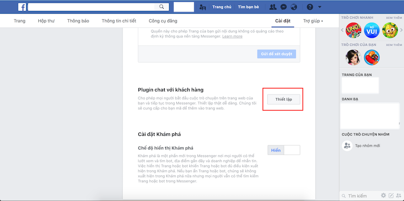 Ở ô Miền đã được đưa vào danh sách hợp lệ (Whitelisted Domains), bạn cần gõ đầy đủ https://tenmien sau đó ấn nút Lưu. Kéo chuột xuống chút nữa, bạn sẽ thấy vùng tên là Plugin chat với khách hàng, Click vào Thiết lập (Set up)
