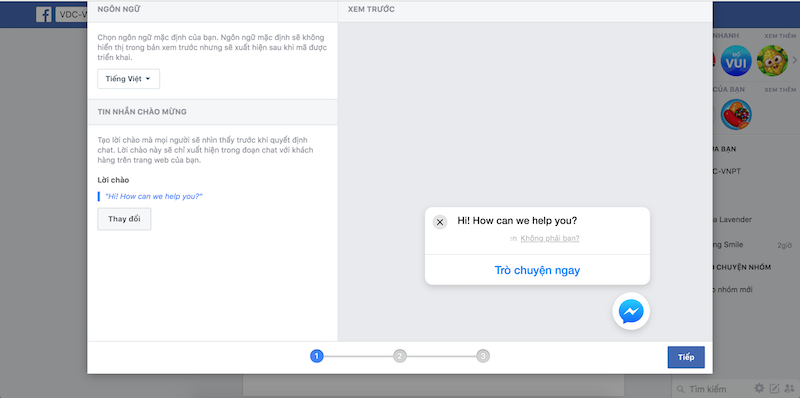 – Màn hình thiết lập sẽ hiển thị ra 1 popup cho chúng ta cấu hình, ở bước 1 sẽ là ngôn ngữ và tin nhắn chào mừng. Bạn nên để ngôn ngữ là tiếng Việt, và thay đổi lời chào cho phù hợp với website của bạn. Nền tảng Messenger cho phép bạn xem trước ngay khi chỉnh sửa như hình dưới