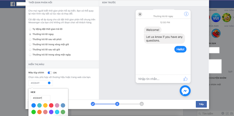 – Click “Tiếp” bạn chuyển qua thiết lập về màu sắc và thời gian phản hồi cho khách hàng biết thường sau bao lâu sẽ nhận được tin nhắn trả lời. Lưu ý, ở video trên chúng tôi có hướng dẫn việc lấy màu sắc sao cho phù hợp với màu website của bạn!
