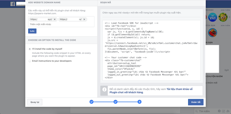 – Bước cuối click đúp vào khu vực “Đoạn mã” để copy mã này, bạn đã hoàn tất cấu hình trên nền tảng Messenger.