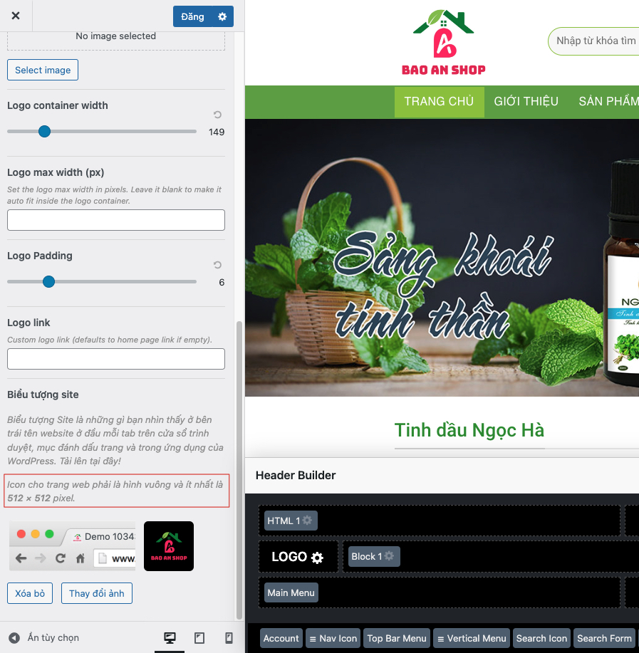 Việc cài đặt cũng khá đơn giản đầu tiên bạn nên chuẩn bị một file ảnh kích thước 512x512px. Sau đó vào mục “Giao diện ( Appearance)” -> “Tùy biến ( Customize)” -> Click chọn mục “Site Identity” như hình dưới.